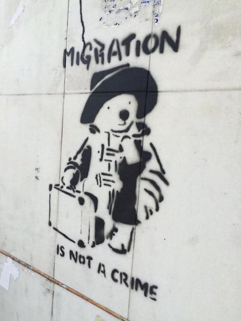 Tre piccioni (i cittadini europei) che con cartelli e slogan cacciano il pappagallo (il migrante africano). È il modo in cui Bansky, con la solita ironia e irriverenza, riassume quello che oggi è il tema pricipale della street art mondiale (nell'immagine di copertina): il dramma di chi scappa da geurra e fame. Un soggetto che sta invadendo i muri delle città di tutto il mondo. Le città si sono colorate di opere di artisti famosi o anonimi che provano a far riflettere sul dramma dei profughi.